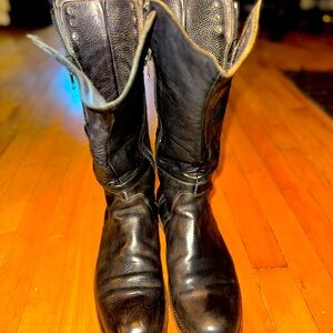 I bought these at the Malibu JV boutique in the mid 2000’s, wore them out a couple of times before sealing and storing. These are amazing boots that were handmade in Italy. Each JV boutique got five pairs of these and I’ve never seen another. Leather is smooth and supple with upper and lowers in excellent condition. They tagged the size 10, but they fit me perfectly as a 10 1/2.
