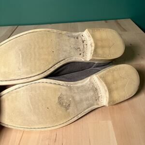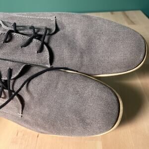 John Varvatos USA lace-up derby shoes in men’s size 13. Gray canvas upper with relatively worn soles and some minor discoloration on the toes.