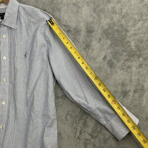 The John Varvatos USA shirt is a men's medium striped button-up casual shirt featuring a peace sign logo. Made from cotton with a woven fabric type, this shirt is machine washable for easy care.
