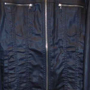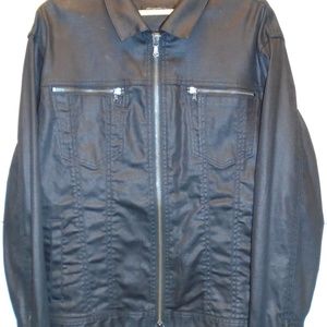 Innovative take on the staple denim jacket, complete with multiple zip enclosures. 99 % cotton, 1% elastane. Perfect for any season. Size is XXL. Color is true black - Pictures reflect light off jacket and is not an exact replica of the jacket appearance live. Jacket is treated denim.