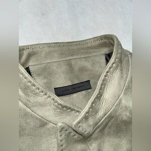 John Varvatos sage green slim fit stand up collar suede jacket NWT size . Fully lined, sample paperwork inside with tags. Very unique color and style is online right now. Lay flat measurements chest 20, sleeve length 25 1/4, and length of jacket from shoulder to bottom of hem 29 inches.