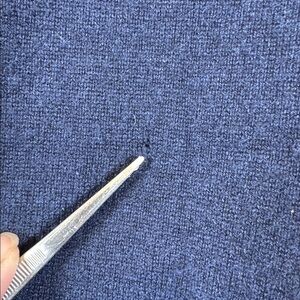 -Two holes both pictured. Holes aren't noticeable when wearing. One hole is the size of a pin drop.