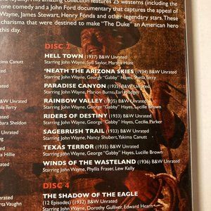 John Wayne remains one of the most beloved icons in the history of American film. With over 142 lead performances, his prolific career established him as the symbol of an American West that epitomized the virtues of courage, toughness, humor and loyalty. This amazing collection features 25 features starring the ever-popular western icon, John Wayne. This 4 DVD collection includes the early films that capture the raw talent and charisma that were destined to make "The Duke" an American hero for the
