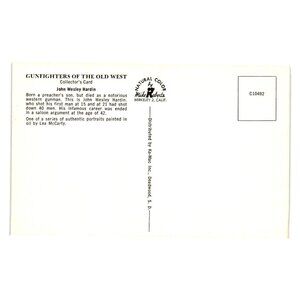 This collector's card features an oil painting by Lea McCarty, capturing the infamous gunslinger John Wesley Hardin. Distributed by Mike Roberts, 1958.