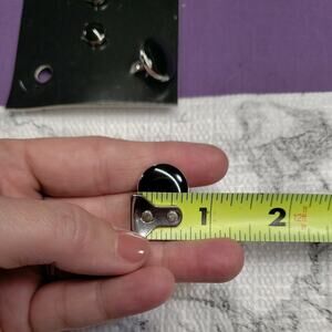 John William Clothing Cufflinks Set, Shiny Black Front, Silver Tone Back. This is a very nice set of men's cufflinks and button studs. They are shiny smooth black acrylic encased in silver tone metal. Two bullet back cufflinks are over half an inch in diameter, and 4 button studs are just under half an inch. Pre-owned and may have minor wear, still on card and in great condition.