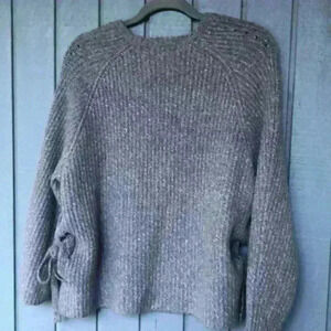Preowned but in good condition. Gray V neck with ties on both side of the sweater. Small Petite
