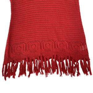 Oversized fringed hem crochet top by John Paul Richard in red women’s size Small. Knitted design at bottom with a zigzag hemline and 3” tassels. Great preowned condition with no stains or snags.
