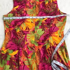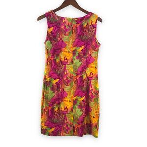 John Roberts bright print sleeveless sheath dress size 10. Green, pink, gold floral print. Very good preowned condition. See pics for care tags and approximate measurements.