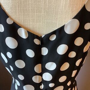 Gorgeous, sleeveless, polka dot dress with elegant gathered details at waist and front of dress. Sheer outer dress material with full black lining. Zips in back. Size 8.