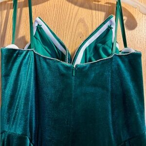 Elegant strapless dress by Johnathan Kayne. Rich green velvet fabric. Perfect for formal occasions. Never worn except to have altered (shortened). I’m 5’3” and had altered to wear with 4” heel with 1” platform. Fabric that was cut will be included and could possibly be used to turn into a corset back. Optional straps included (velvet). A small section of sparkly trim is missing around bust (see picture), but there is extra included for replacement.