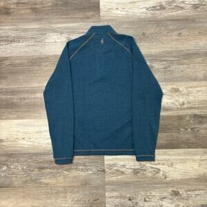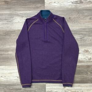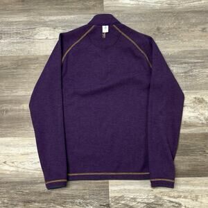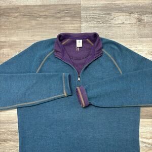 Johnnie-O Blue Purple Mens M 1/4 Zip Blue Black Mock Neck Reversible Sweater. purple and blue colorway quarter zip mock neck, logo on back neck raglan long sleeve knitted cotton blend with stretch contrast stitching classic stretchy casual outdoors coastal preppy surf surfer beachy.