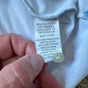Polyester/Spandex blend. Shirt is in EXCELLENT, pre-owned condition.