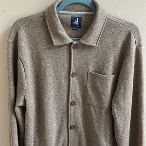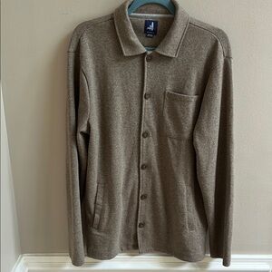 Johnnie-O Men’s Tudor Knit Sweater Jacket. Wool blend(polyester, wool, viscose, nylon). Buttons down front with spread collar. Knit sport coat. Perfect between seasons weight. the color is camel, but it looks more brown to me. Size medium