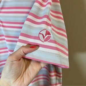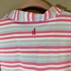 Johnnie-O men’s pink and blue striped golf polo shirt.