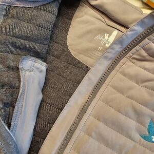 Johnnie-O Quilted Performance Vest Seal Lightweight Mens S Water Resistant. Excellent Condition. Color is Seal (light gray). Layflat Measurements are: Length 25 / Chest (pit-to-pit) 21. The Johnnie-O Quilted Performance Vest in seal color is a lightweight, water-resistant essential for sporty fashion. Designed for golf apparel and casual mens outerwear, this windproof zip-up vest features a hidden hood for versatility. Whether layering for warmth or styling for a breathable sporty look, this stylish golf outerwear is a must-have for Johnnie-O menswear fans.