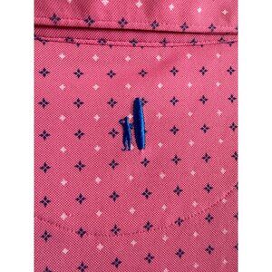 Johnnie-O polo shirt for men in XL featuring a smooth polyester/spandex fabric blend. The eye-catching pink base with a geometric pattern enhances its timeless aesthetic. This short-sleeve shirt has a classic fold-over collar and button-up closure, perfect for versatile wear.