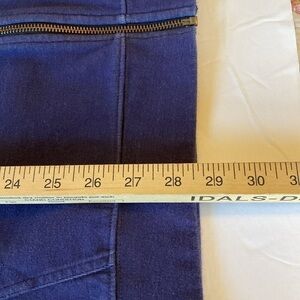 It is a thick sweatshirt type material with kangaroo pouch, full zipper. There’s no drawstring in the hood there’s not supposed to be one, but there’s not one, so you don’t have to worry about that getting lost or torn out and there are no flaws. Navy blue with white and blue stripes. Good quality.