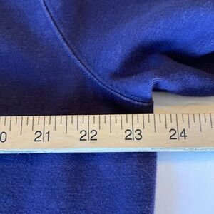 It is a thick sweatshirt type material with kangaroo pouch, full zipper. There’s no drawstring in the hood there’s not supposed to be one, but there’s not one, so you don’t have to worry about that getting lost or torn out and there are no flaws. Navy blue with white and blue stripes. Good quality.