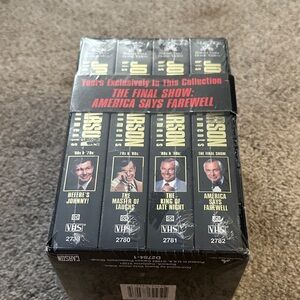 Johnny Carson VHS collection featuring classic late-night shows. Includes four tapes with iconic moments.