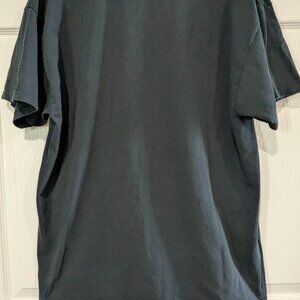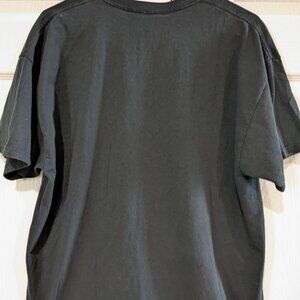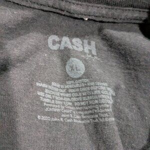 Johnny Cash men's black short sleeve T-shirt, size XL, featuring "The Man in Black Since 1932 Nashville TN" graphic. Made of 100% cotton with a crew neck, this pre-owned shirt has had the care tag removed. Measures approximately 23.5" armpit to armpit, 29" from center back of neck to hem, and 7" from shoulder seam to cuff.