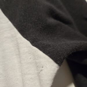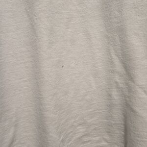 Super lightweight with a lived in feel. Two small holes as shown in pictures: one on the back near armpit and one in the front lower bottom of shirt.