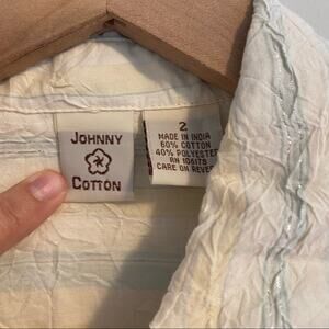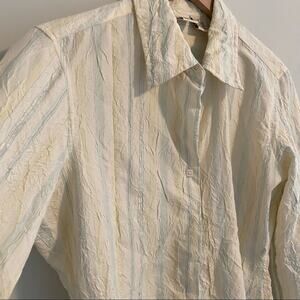 I really adore this super pretty and comfy Johnny Cotton designer lightweight cotton/poly blend pastel yellow/blue/silver metallic striped long sleeve button front slightly cropped blouse/top
