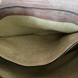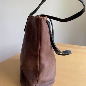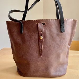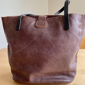 Beautiful NWOT Johnny Farah handbag, style "Argentina". Natural brown leather with black shoulder handles. Exquisite waxed linen hand stitching details, and brass knob/tab closure. Interior is lighter colored linen, and includes full-side zipper pocket. Leather has a waxy appearance, with lots of grain. Size is 11" tall by 14"wide by 6" deep, with shoulder drop of 9". Very comfortable to use as a shoulder bag or handbag. Purchased at IFSohoNewYork. Leathergoods line similar to Henry Cuir.