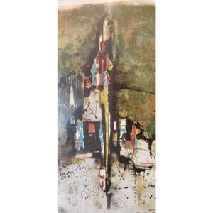 This mid-century composition features earthy tones of green, ochre, and ivory accented with red and blue geometric elements — characteristic of Friedlaender’s elegant balance of movement and stillness.
