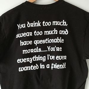 Black T. Used with two small holes (pictured). Priced accordingly! No tags.