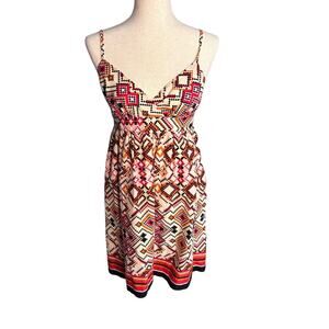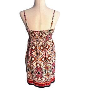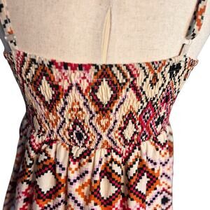The Johnny Martin dress is a vibrant multicolor sundress in size medium, perfect for summer, fall, and spring occasions. This geometric patterned dress features a V-neckline, sleeveless design, and adjustable straps for a comfortable fit. Made of cotton and machine washable, this short fit and flare dress is lined and accented with smocking details, making it a stylish choice for both casual and party or cocktail events.