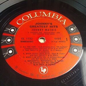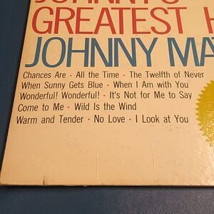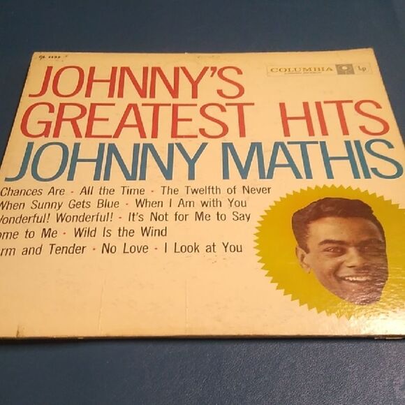 Johnny Mathis Greatest Hits vinyl record. Features classic songs. Iconic album cover design.