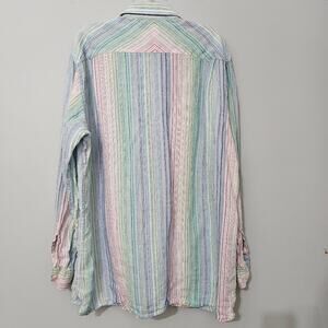 Keywords: linen shirt, resort wear, vacation shirt, pastel stripes, beach shirt, lightweight button down, summer casual, oversized shirt, johnny was