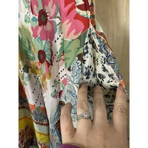 The Johnny Was 100% Silk Floral Patch Lagenlook Hippie Boho Maxi Dress in size Large is a stunning piece of women's clothing that exudes a hippie and boho style. Made from luxurious silk material, this long dress features a beautiful floral pattern in multicolor, a V-neckline, and short sleeves, perfect for those who love a relaxed and comfortable fit. The brand's unique design and attention to detail make this dress a standout choice for those looking to make a statement with their fashion choices.