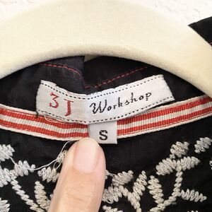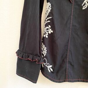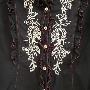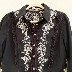 Johnny Was 3J Workshop Black White Button Up Ruffled Embroidered Regal Shirt S