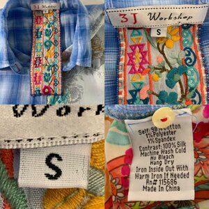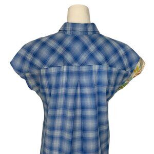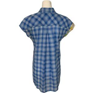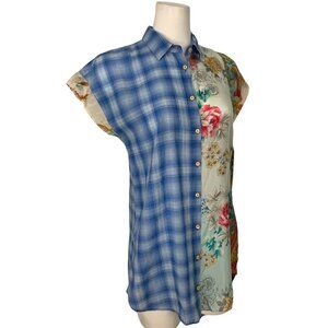 This Johnny Was 3J Workshop Blouse Tunic makes a statement due to it's cap sleeve, button front, spread collar, curved hem with side slits, lightweight, unlined and blue plaid floral colorblock design.