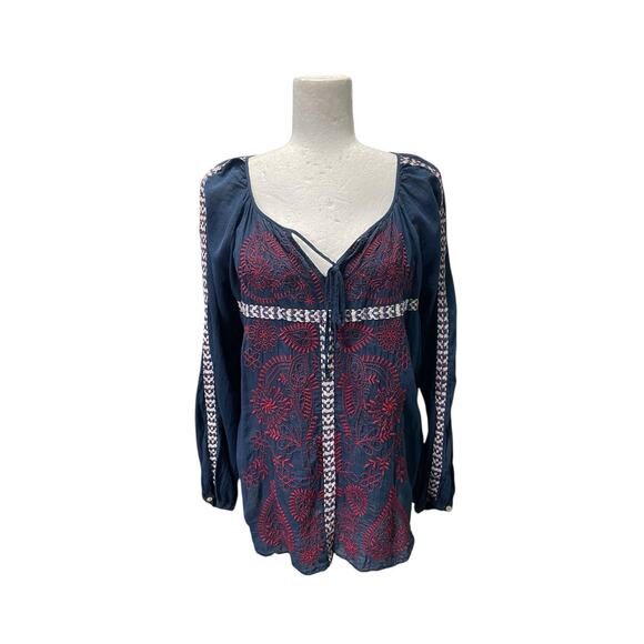 Johnny Was 3J Workshop Blue Red Embroidered Tunic Top Cotton Long Sleeve Small