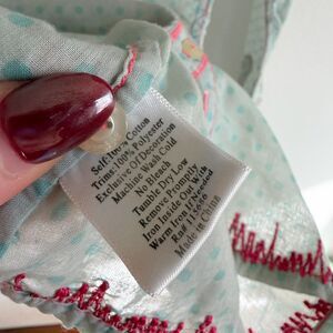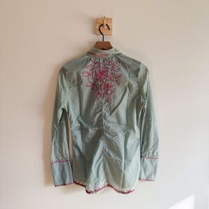 Johnny Was Embroidered Button Down Shirt in Fog Blue. Features dotty fabric, embroidery details on trim and front & back center, long sleeve, collared, & lightweight. In good condition. No holes, rips, or stains. Ours is a smoke free home.