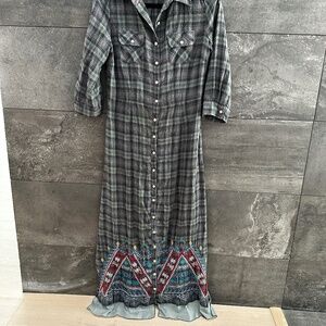 Johnny Was 3J Workshop Plaid Flannel Embroidered Maxi Shirt Dress size S