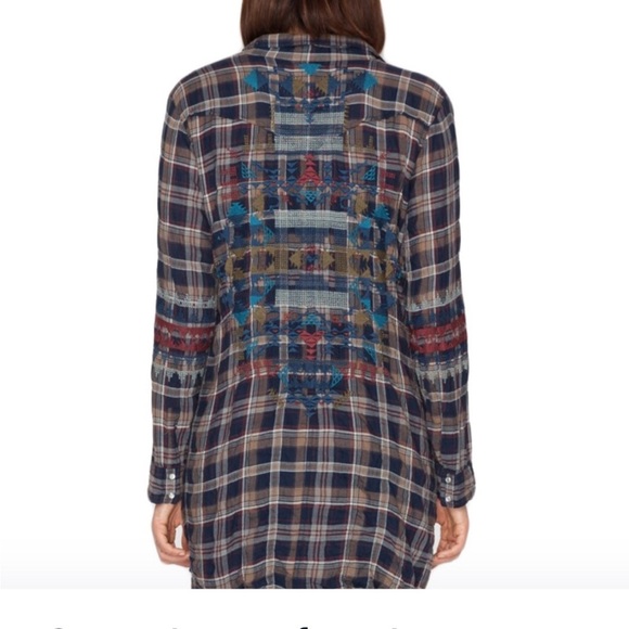 Johnny Was 3J Workshop long plaid embroidered lightweight button front shirt S