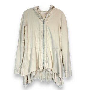 Johnny Was 4 Love & Liberty Peplum Hoodie Jacket Victorian Velvet Accents Cream Ivory Medium. This Zip-front hoodie features a layered, flowy hem with sheer chiffon ruffles for that effortless boho look.