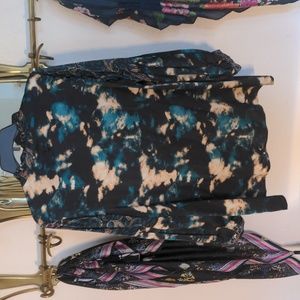 Johnny Was silk blouse. popover styling with v-neck and ruffle collar 3/4 length sleeves with embroidery and button. 100% silk. beautiful greens and blacks and blues. 21 inches pit to pit. Slight high low hem.