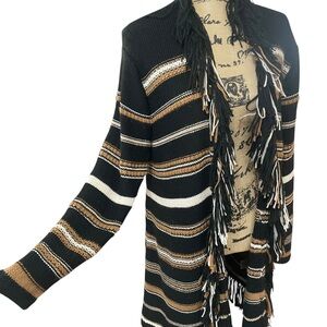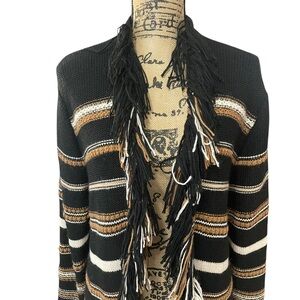 Johnny Was Ada Striped Cardigan Black Striped Fringe Alpaca Wool Size Large