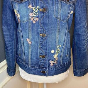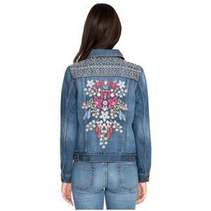 Johnny Was Aubrieta Cali Classic Embroidered Jean Jacket in multi colored tread and a medium wash lightly distressed denim