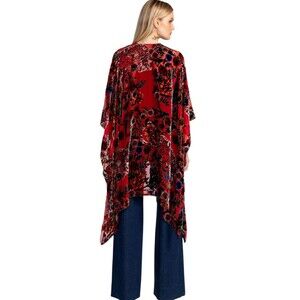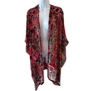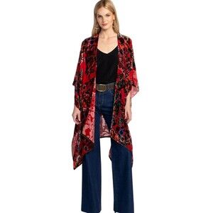 The Johnny Was BOBCAT Red Burnout Velvet Valour Shawl R98424-O is a stylish and relaxed fit blouse designed for women. This kimono-style top features a beautiful floral pattern on vibrant red velvet fabric, making it a standout piece in any wardrobe. With kimono sleeves and a pullover closure, this one-size top offers both comfort and style for any casual or dressed-up occasion. Perfect for those who appreciate unique and eye-catching designs from a reputable brand like Johnny Was.