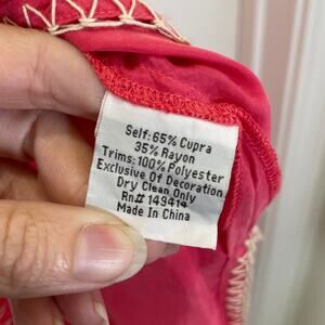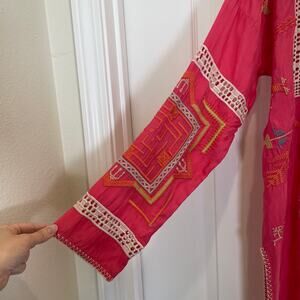 Watermelon pink, white and multicolor Charlize embroidered blouse by the Biya line of Johnny Was. Brand new with tags. Featuring a round neckline, long sleeves, eyelet lace accents, and slits on the sides. Embroidery is done in a needlepoint / stitchwork style. Oversize fit - will likely fit sizes larger than a small also. Bust across the front area measures approx. 23.5 inches.