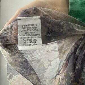 Style features: V-neck; sheer mesh overlay; intricate floral embroidery across bodice and skirt; geometric embroidered patches near hem; softly pleated/gored skirt; lined for coverage