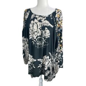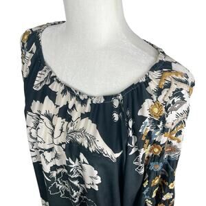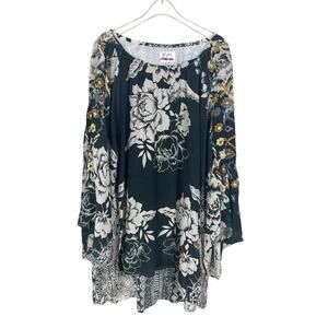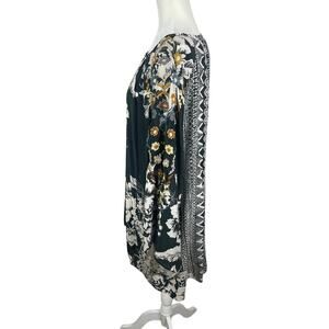 Beautiful Johnny Was 100% silk floral print tunic top. Floral print to the front with a ethnic boho print to the back. Flutter 3/4 sleeves with embroidery to top part of sleeve. Elastic scoop neckline. Oversized. Black and cream color way. Multicolor embroidery. Size medium
