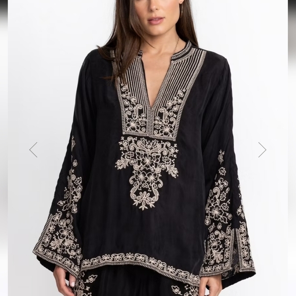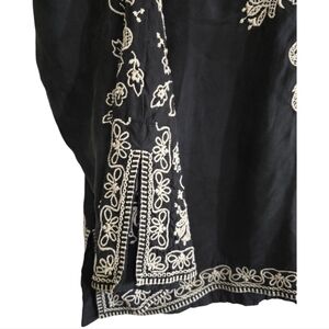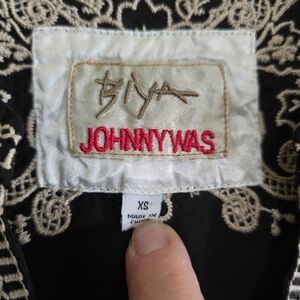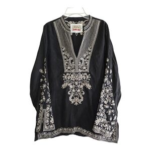 Johnny Was Biya Tempest Blouse XS Black With White Embroidery Slit Cuffs/Hems