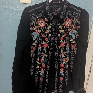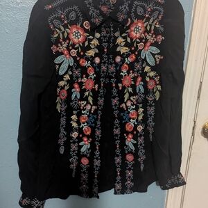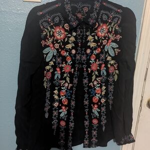 Chic black blouse adorned with vibrant floral embroidery. Features striking red, blue, and green patterns.