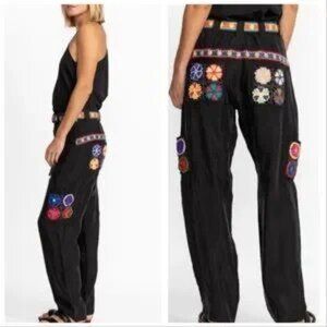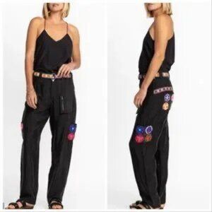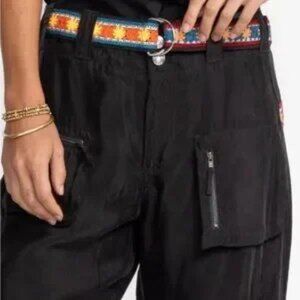 Johnny Was Black Crochet Embellished Silky Cargo Pants With Patterned Belted